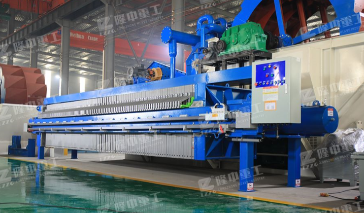 廂式壓濾機(jī)是通過濾板的擠壓,使污泥內(nèi)的水通過濾布排出,從而達(dá)到脫水目的。也稱進(jìn)漿脫水,即一定數(shù)量的濾板在強(qiáng)機(jī)械力的作用下被緊密排成一列,濾板面和濾板面之間形成濾室,過濾物料在強(qiáng)大的正壓下被送入濾室,進(jìn)入濾室的過濾物料其固體部分被過濾介質(zhì)(如濾布)截留形成濾餅,液體部分透過過濾介質(zhì)而排出濾室,從而達(dá)到固液分離的目的。