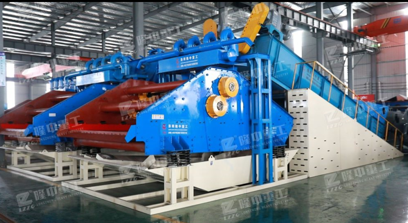 經(jīng)過破碎篩分后的物料進(jìn)入螺旋洗砂裝置,清洗之后合格物料將進(jìn)入后端尾礦干排裝置進(jìn)行脫水,由于固體物粒大小的不同,比重不同,所以液體中的沉降速度不同,細(xì)顆粒浮游在水中成溢流出,粗顆粒沉于槽底,由螺旋洗砂一體機(jī)的螺旋推向上部排出,同時利用水力和機(jī)械力使礦石碎散并擦洗礦石上的雜質(zhì)和泥土,洗下礦石表面細(xì)泥并分離。旋流器的沉沙嘴位于尾礦干排篩的上方,形成濃縮后的物料落入尾礦干排篩,而旋流器分離的水體流入到回收水箱內(nèi)部。其余廢水進(jìn)入反水裝置排出,完成整個流程。