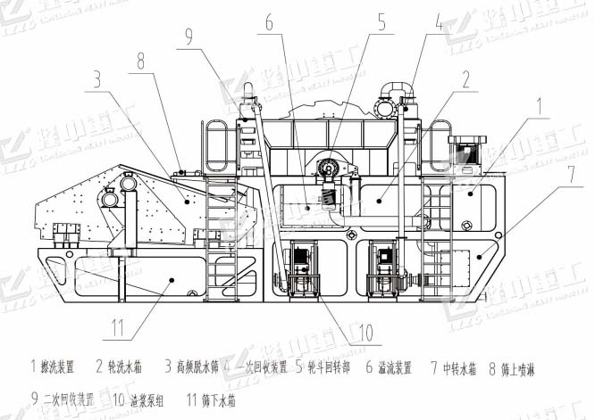 物料先經(jīng)過擦洗機(jī)進(jìn)行擦洗,除去砂顆粒表面附著的泥粉;擦洗后的物料進(jìn)入輪洗洗砂機(jī)進(jìn)行二次清洗;擦洗機(jī)和輪式洗砂機(jī)溢流水進(jìn)入副水箱進(jìn)而進(jìn)入旋流器進(jìn)行細(xì)砂回收,同時(shí)將擦洗和洗砂過程中的泥水由旋流器反水口溢流到尾水處理系統(tǒng)。經(jīng)過擦洗機(jī)和輪式洗砂機(jī)清洗后的粗、細(xì)砂進(jìn)入脫水篩進(jìn)行脫水,脫水篩下水箱的水由泵送入旋流器進(jìn)行第二次細(xì)砂回收,同時(shí)將泥水由旋流器反水口溢流到尾水處理系統(tǒng)。