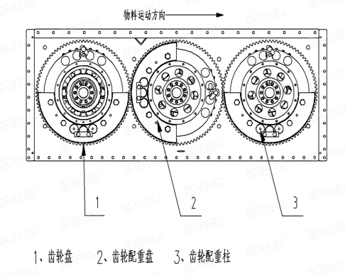 三軸橢圓篩的激振器是由三根并列的振動(dòng)軸組成,位于篩箱一側(cè)的振動(dòng)軸的一端裝有速比為1的互相嚙合的三個(gè)齒輪; 振動(dòng)篩工作時(shí),電機(jī)皮帶傳動(dòng)裝置帶動(dòng)激振器的三個(gè)齒輪旋轉(zhuǎn),由于三根軸上均裝有相等的偏心質(zhì)量、相同的偏心半徑的配重盤,由等參數(shù)的齒輪同步連接,因此篩箱的運(yùn)動(dòng)軌跡呈現(xiàn)為橢圓形,即單軸振動(dòng)篩的圓運(yùn)動(dòng)軌跡和雙軸振動(dòng)篩的直線運(yùn)動(dòng)軌跡的合成運(yùn)動(dòng)軌跡。橢圓的運(yùn)動(dòng)軌跡可以使物料擁有更大的運(yùn)行速度,提高設(shè)備的產(chǎn)量。